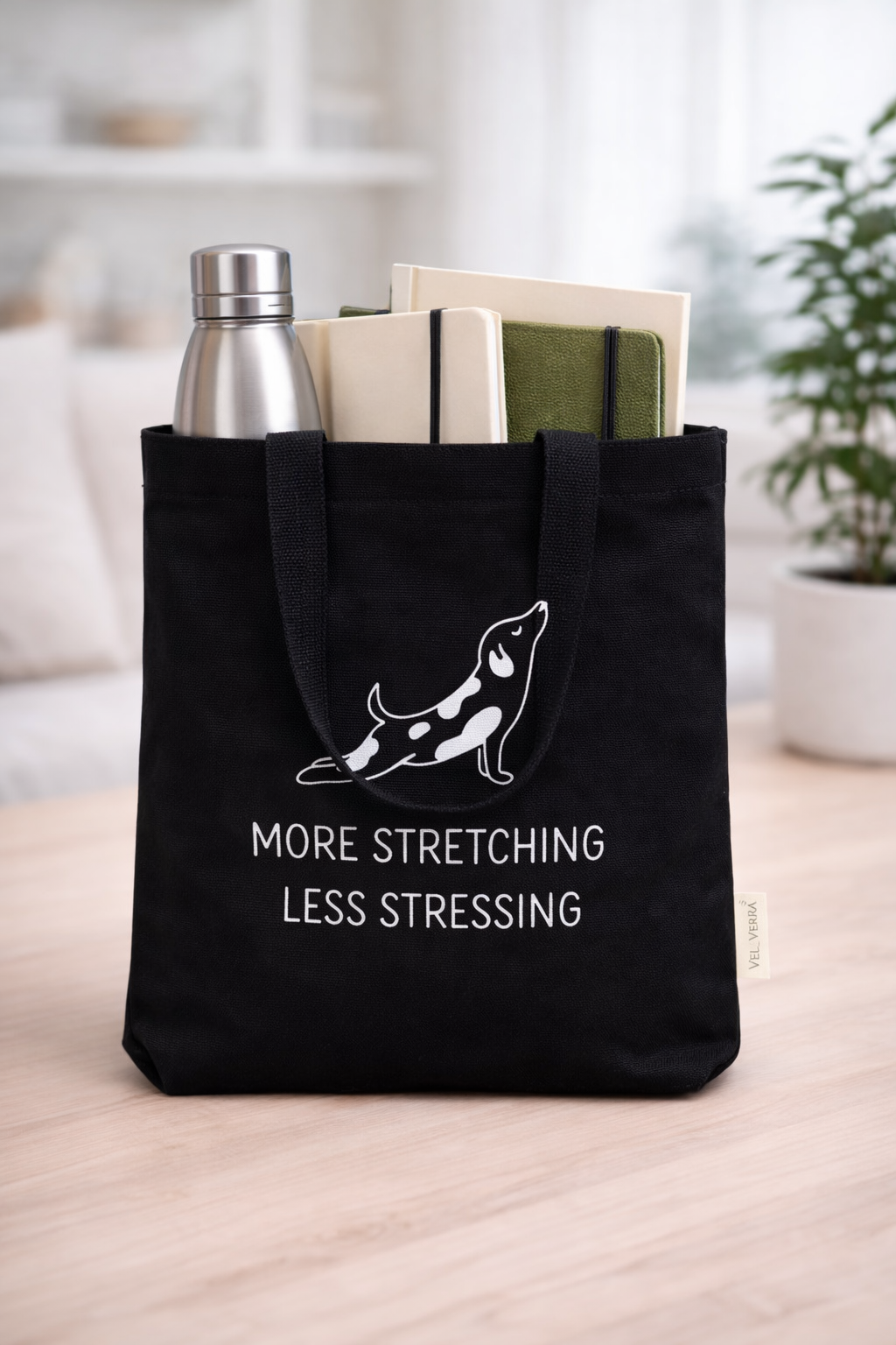 the message “More Stretching Less Stressing.” Perfect for shopping, books, work, gym and