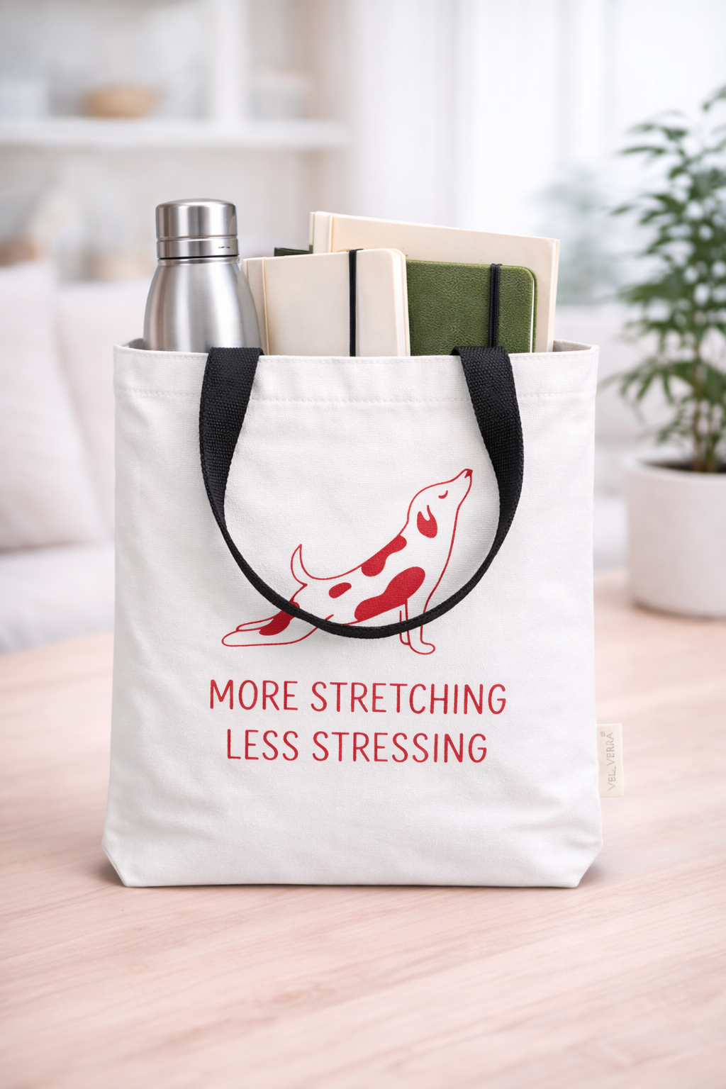 the message “More Stretching Less Stressing.” Perfect for shopping, books, work, gym and