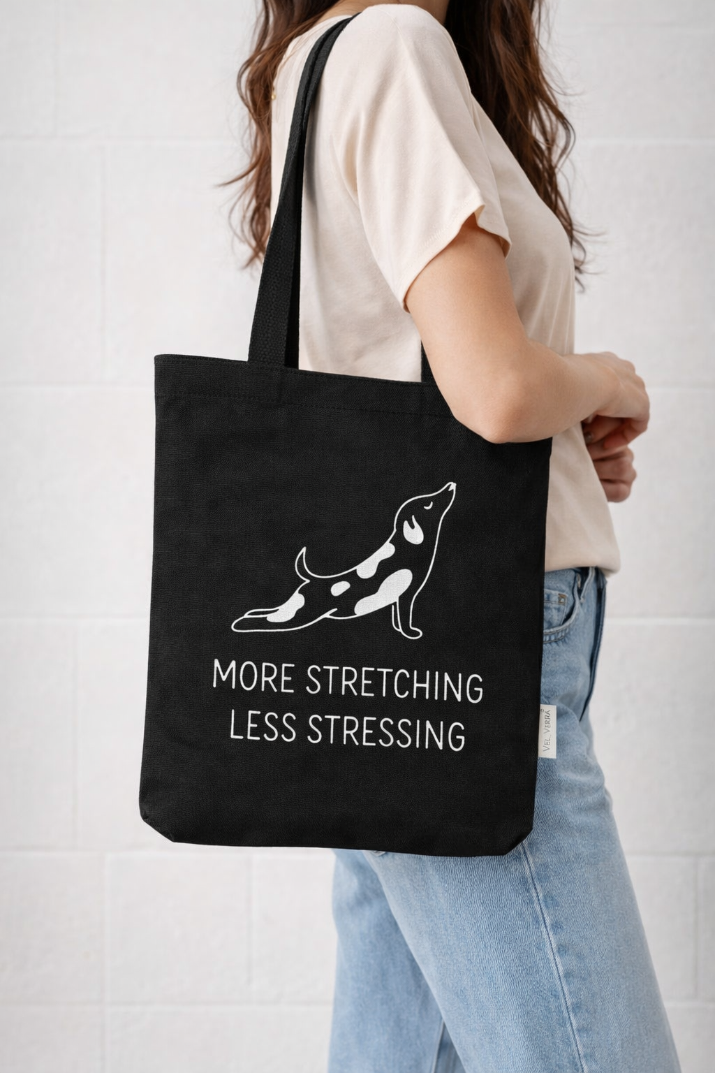 the message “More Stretching Less Stressing.” Perfect for shopping, books, work, gym and