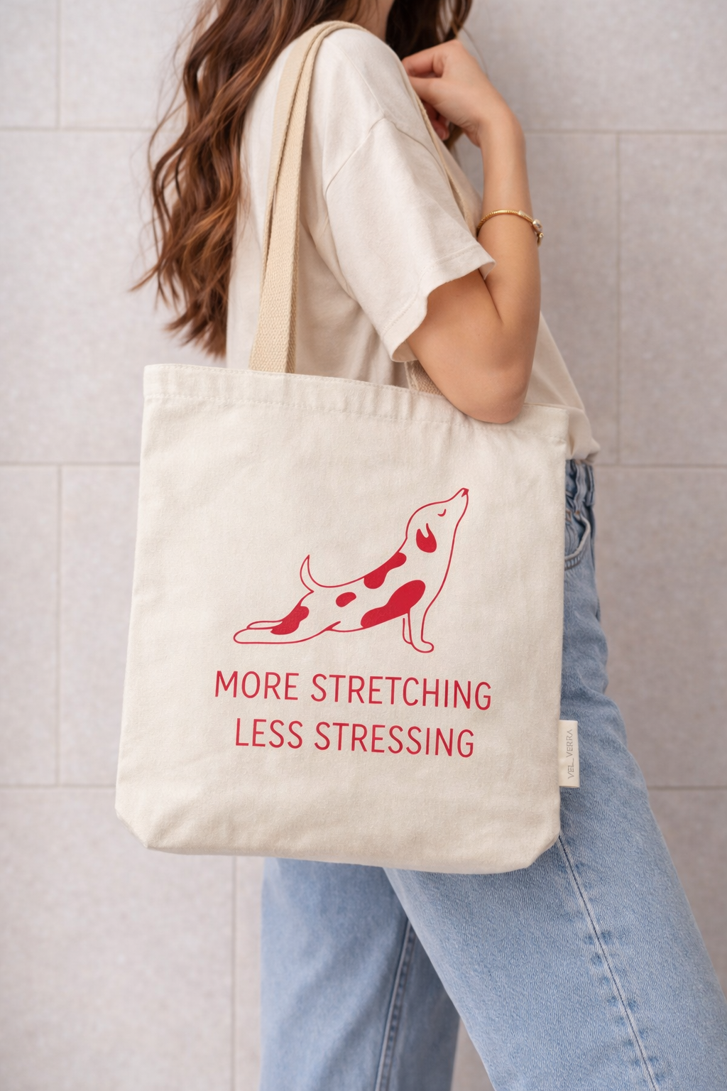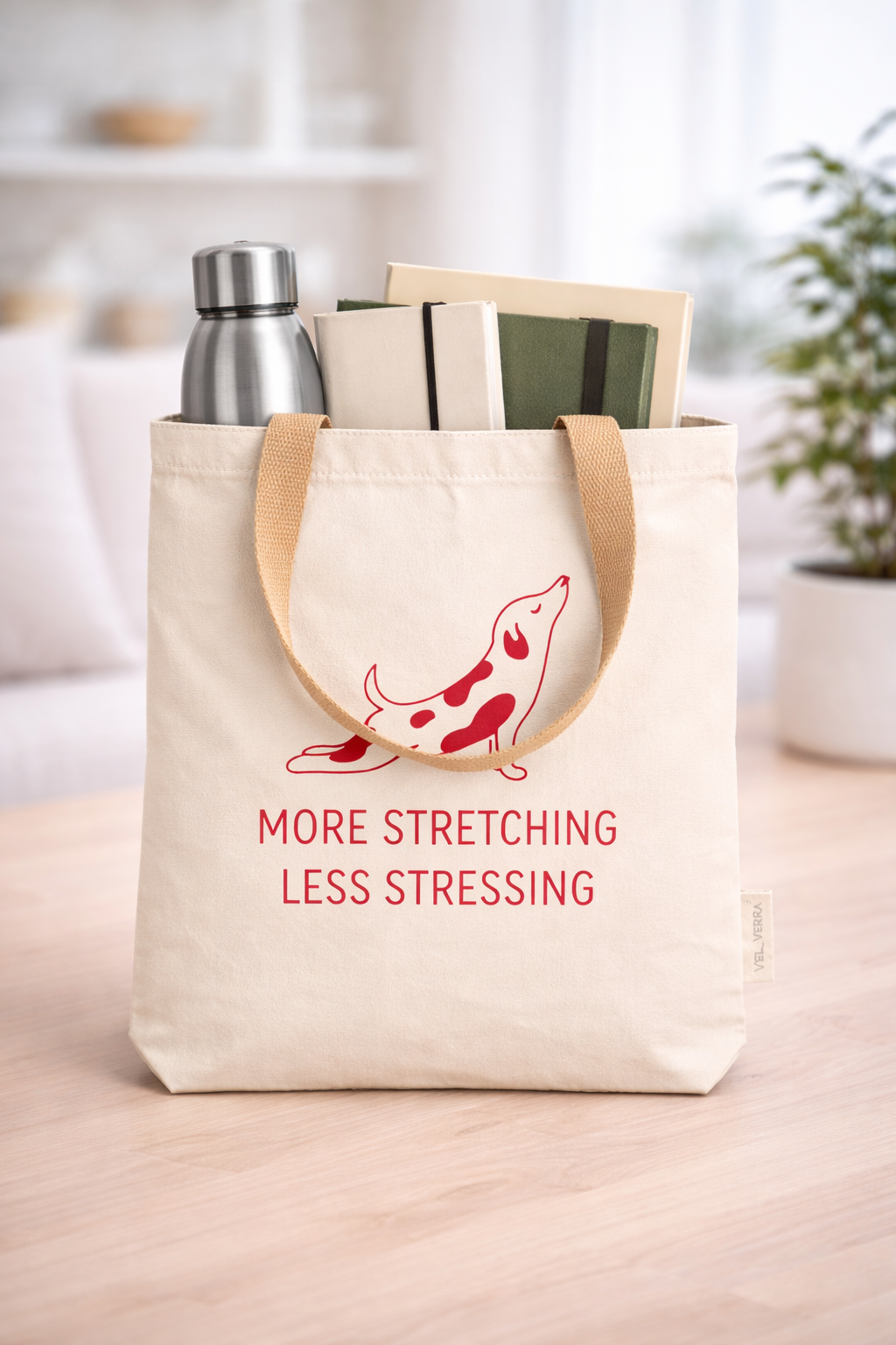 the message “More Stretching Less Stressing.” Perfect for shopping, books, work, gym and