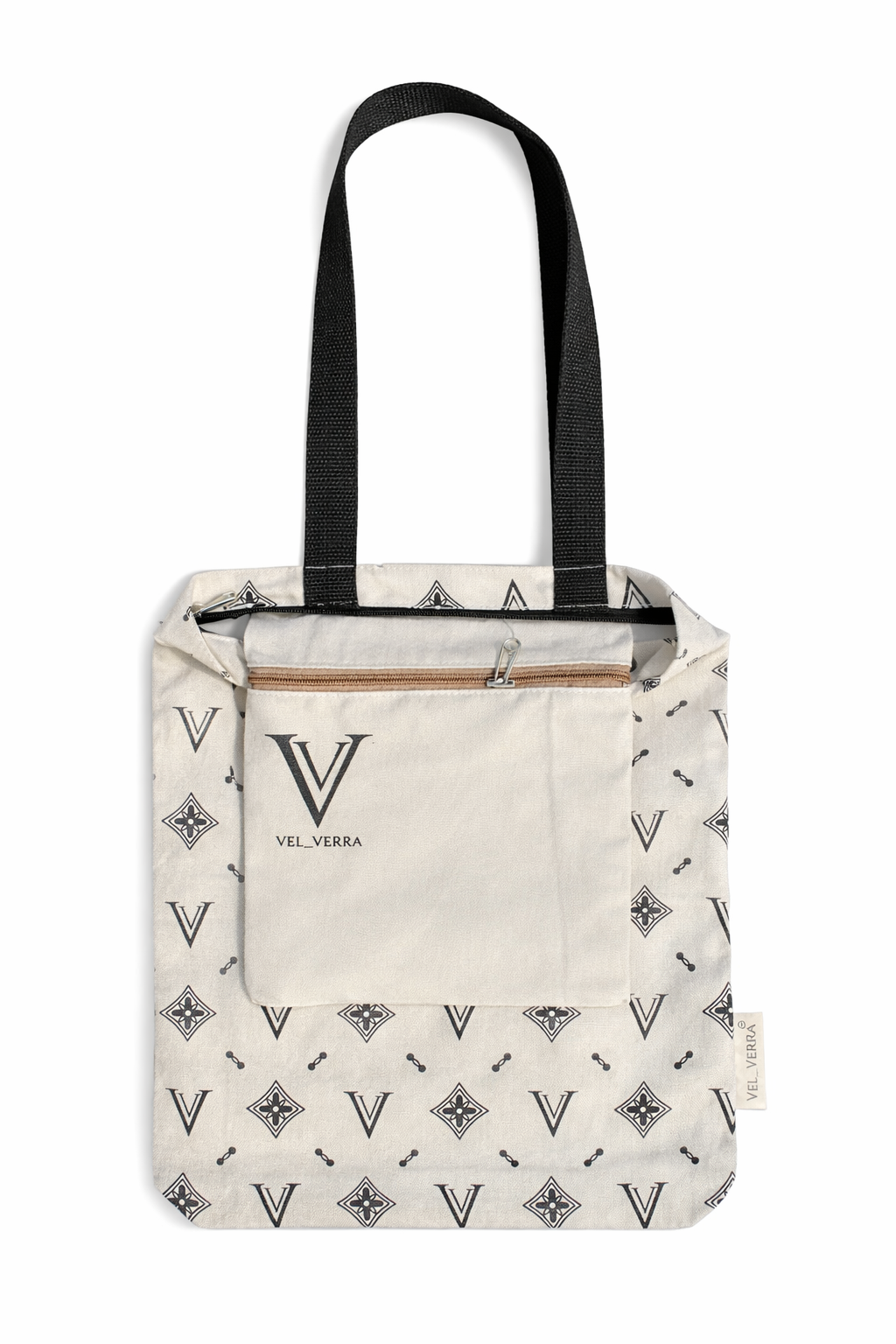 Featuring luxury webbing handles, a secure inner zipper pocket, and the "Vel_Verra signature logo pattern" for a premium look. Perfect for shopping, work, gym, and
